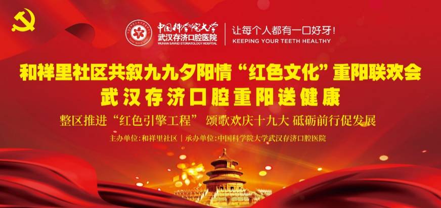 10月27日,正值重阳佳节来临之际,为落实国家“医疗惠民”政策,同时丰富老年人业余文化生活,不断满足老年人的精神文化需求,中国科学院大学武汉存济口腔医院特联合和祥里社区举办了口腔义诊 及“九九夕阳情”重阳节大型联欢会,为老年人献上了一份健康、娱乐、贴近群众的文化大餐。和祥里社区、武汉市消防支队特勤一中队,社区幼儿园为此次活动...